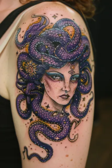 Cosmic Medusa Shoulder Tattoo in Purple and Gold