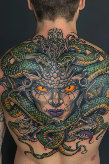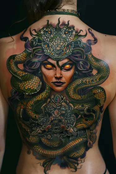 This incredibly detailed full-back tattoo brings Medusa to life in the most intense and commanding way. Her piercing golden eyes seem to glow, locked in a gaze that is both hypnotic and terrifying. The intricate scale patterns on her forehead merge seamlessly into the writhing mass of emerald green serpents, each one coiled in a striking, aggressive pose. The shading and highlights on the snakes give them an almost three-dimensional texture, making them look like they re ready to slither right off the skin. Deep purple lips add a bold contrast, giving Medusa a touch of deadly elegance.