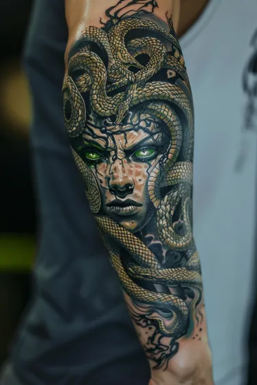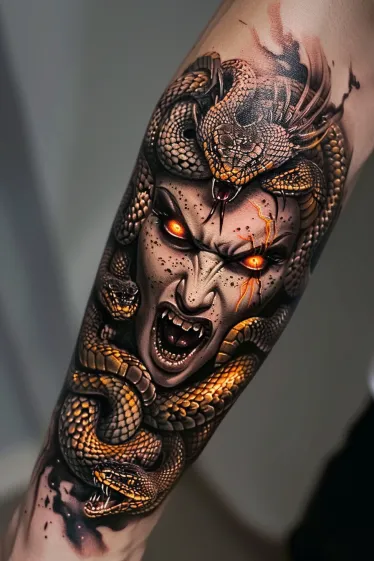 Fierce Medusa Forearm Tattoo with Glowing Eyes
