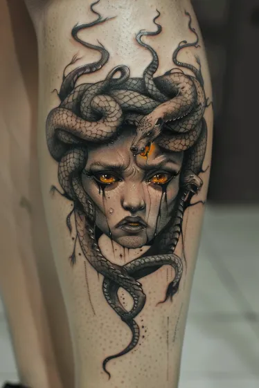 Realistic Medusa Calf Tattoo with Piercing Golden Eyes