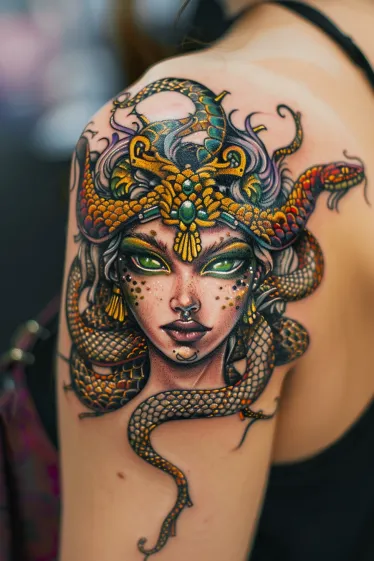 Vibrant Medusa Shoulder Tattoo with Jewel Crown