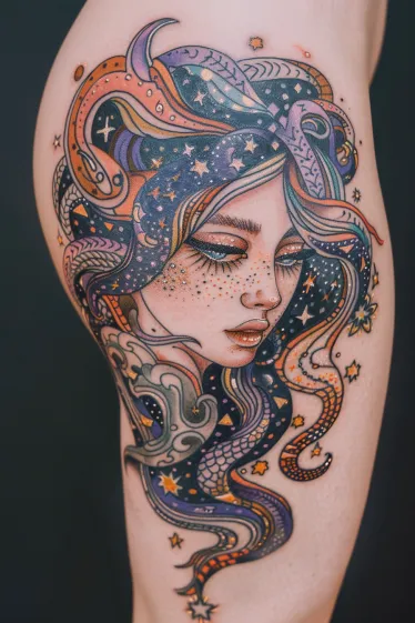 Celestial Medusa Thigh Tattoo with Cosmic Serpents