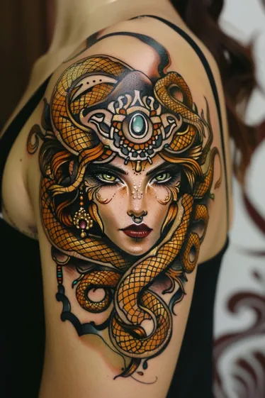 Golden Medusa Shoulder Tattoo with Emerald Crown
