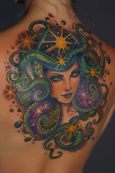 Galactic Medusa Back Tattoo with Cosmic Snakes
