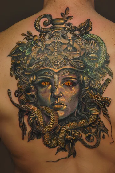This stunning full-back tattoo transforms Medusa into a goddess-like figure, exuding power, mystery, and beauty. Her metallic golden skin shimmers under the light, giving her an almost statue-like presence. Her intense amber eyes seem to glow, radiating a hypnotic gaze that feels both alluring and dangerous. A highly detailed ornate crown, adorned with intricate carvings and floral elements, sits on her head, blending seamlessly into her flowing hair of serpents. The rich gold and deep black shading create an almost three-dimensional effect, making every scale and strand stand out with incredible realism.