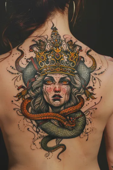 Royal Medusa Full Back Tattoo with Ornate Crown