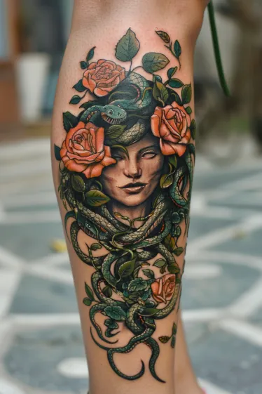 Floral Medusa Leg Tattoo with Roses and Serpents