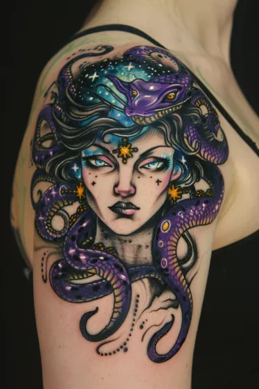 Galactic Medusa Shoulder Tattoo with Cosmic Snakes