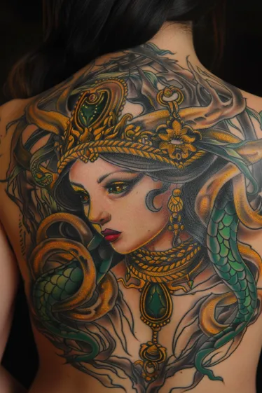 Regal Medusa Full Back Tattoo with Golden Crown and Emerald Snakes