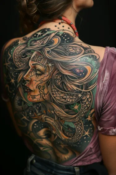 Celestial Medusa Full Back Tattoo with Cosmic Snakes