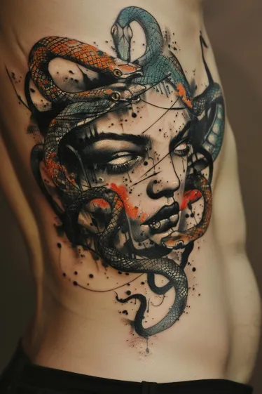 Abstract Watercolor Medusa Side Tattoo with Snakes