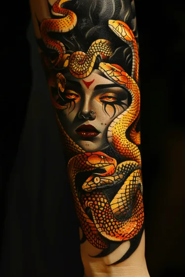 Fiery Medusa Forearm Tattoo with Golden Snakes