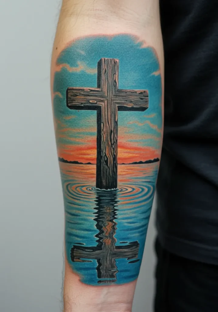 Wooden Cross Tattoo with Sunset Reflection on Forearm