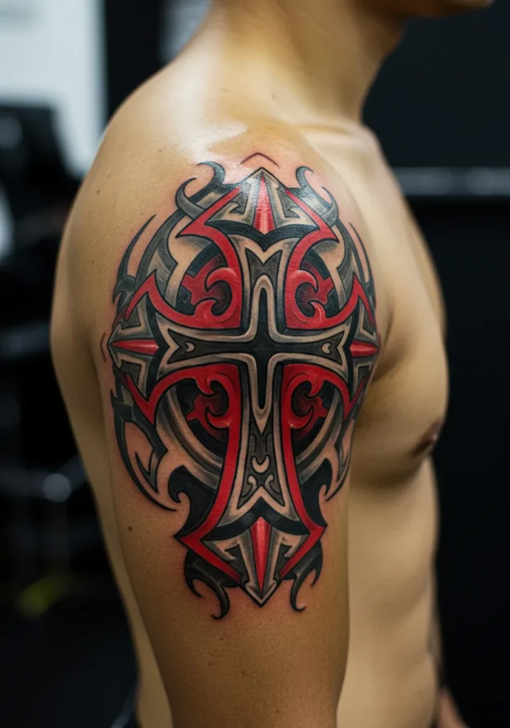 This tattoo brings serious attitude with its bold tribal patterns swirling around a powerful cross. Thick black lines create an intense design that wraps perfectly around the shoulder, while deep red accents slice through the shapes to add extra fire and energy. The cross itself stands strong in the center, framed by intricate curves that give it a fierce but stylish edge. The way the colors and lines blend together makes it look dynamic from every angle.