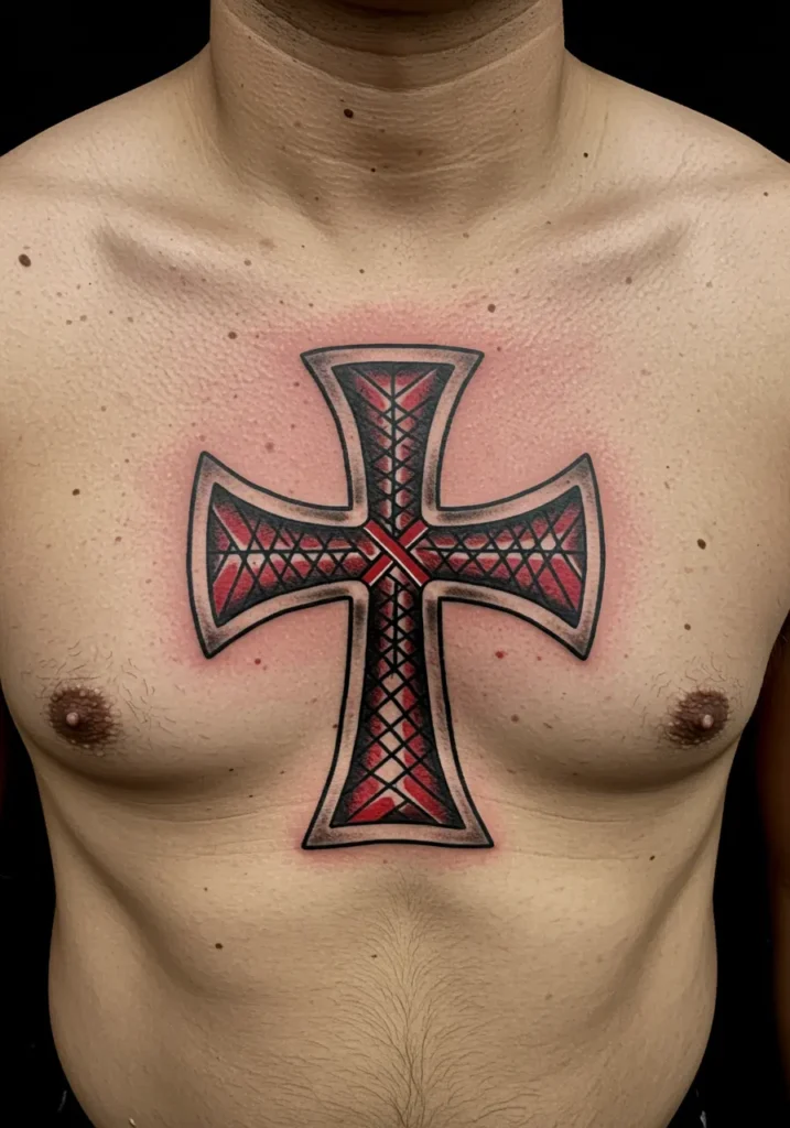 This tattoo features a large, striking cross with thick black outlines and a bold, eye-catching design. The inside of the cross is filled with a red and black diamond pattern that almost looks like scaled armor, giving it a strong and fierce vibe. The shading creates a beautiful contrast, making the colors pop even more against the skin. It sits perfectly centered on the chest, making it a true statement piece that feels powerful and fearless.