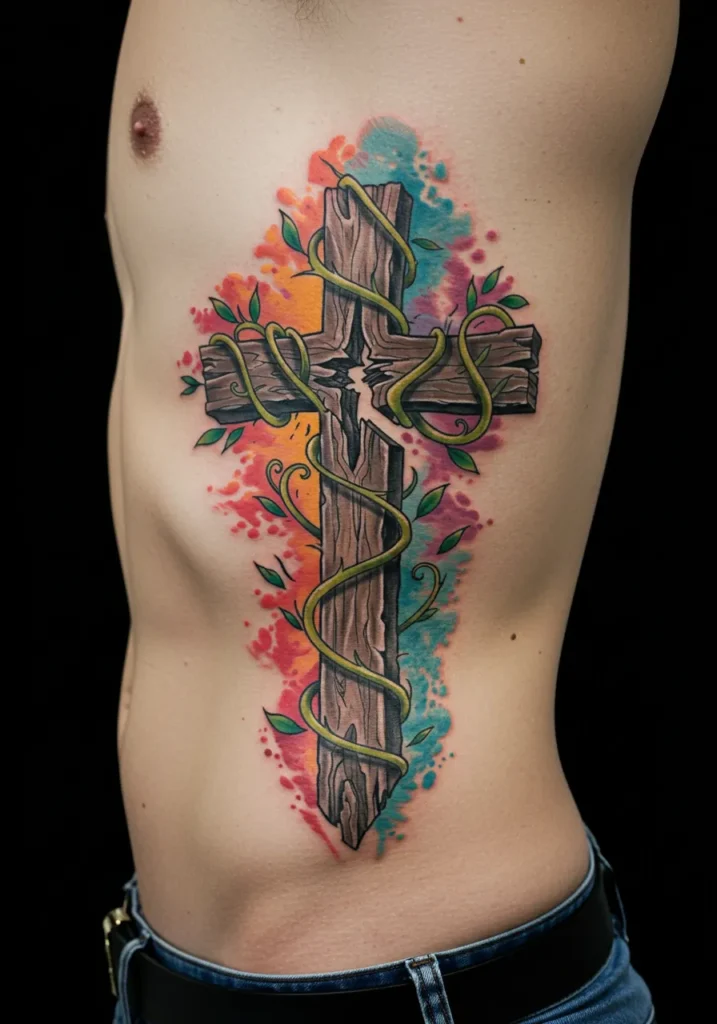 This gorgeous rib tattoo features a rustic wooden cross wrapped in lively green vines, all set against a dreamy watercolor background of fiery reds, cool blues, and warm oranges. The woodgrain texture on the cross looks almost touchable, while the vines bring a soft, organic feel that ties everything together. The splash of watercolor around it creates such a playful contrast, making the entire piece feel vibrant, fresh, and full of life.