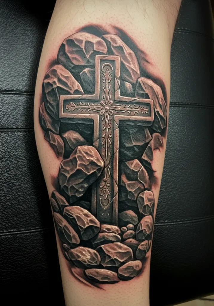 This tattoo features a beautifully detailed cross that looks like it was carved straight out of stone. It is framed by rugged rocks that seem to push out from the skin, giving the whole piece an incredible three-dimensional effect. The cross itself has delicate engraved patterns running through it, adding a softer, almost sacred touch to the otherwise rough and powerful design. The use of shading is amazing here, making the rocks look super realistic while keeping the cross bold and unshakable right in the center.