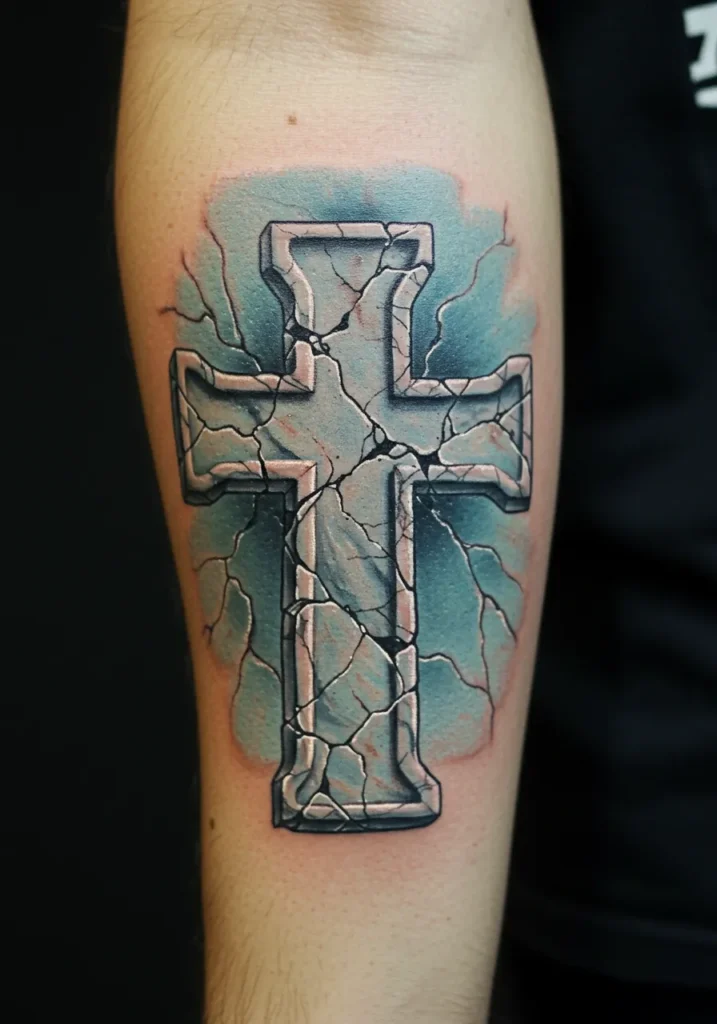 This tattoo shows a rugged stone cross that looks like it has been through centuries of storms but is still standing strong. The cross is detailed with deep cracks and weathered textures, giving it a bold, battle-scarred look. Behind it, a soft blue background with subtle crackling effects adds just enough contrast to make the cross pop without stealing the scene. Placed on the forearm, it feels like a personal badge of endurance and faith carved straight into the skin.
