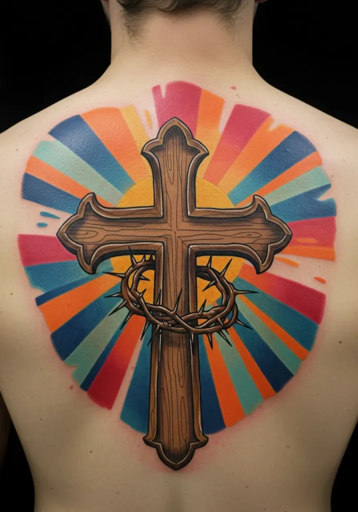 This tattoo brings a fresh, joyful vibe with a beautifully detailed wooden cross sitting at the center of a vibrant explosion of color. Wrapped around the cross is a crown of thorns, adding a touch of depth and tradition. Behind it, bold rays in shades of blue, orange, red, and yellow burst outward like a sunrise, giving the whole piece an incredible sense of hope and energy. The wood grain detailing on the cross is so realistic, it feels like you could almost run your hand across it.