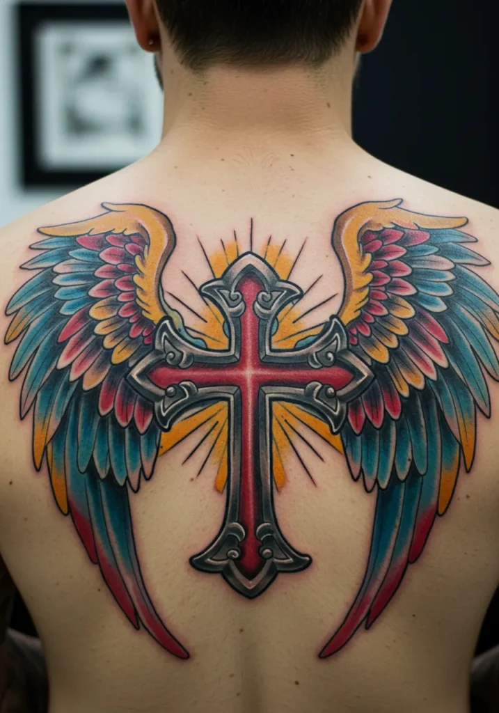 This tattoo covers the upper back with a gorgeous cross sitting right in the center, framed by a pair of colorful, detailed angel wings. The wings are filled with rich shades of blue, red, and golden yellow, giving them a vibrant, almost glowing feel. The cross itself has a bold metallic look, edged with intricate scrollwork and a deep red core that ties it all together. Radiating lines behind the cross add an extra pop, making the whole design feel full of life and energy.