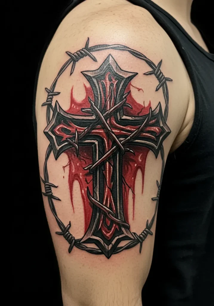 This tattoo features a fierce cross design wrapped tightly in barbed wire, with rich red ink flowing behind it like a bold splash of paint. The black and grey cross has strong, sharp lines that make it look almost like metal, while the barbed wire circles around it in a way that feels both raw and symbolic. The background adds a dramatic vibe, almost as if the cross is pushing through pain and chaos but still standing strong. The placement on the upper arm gives it the perfect canvas to really show off all the fierce details.