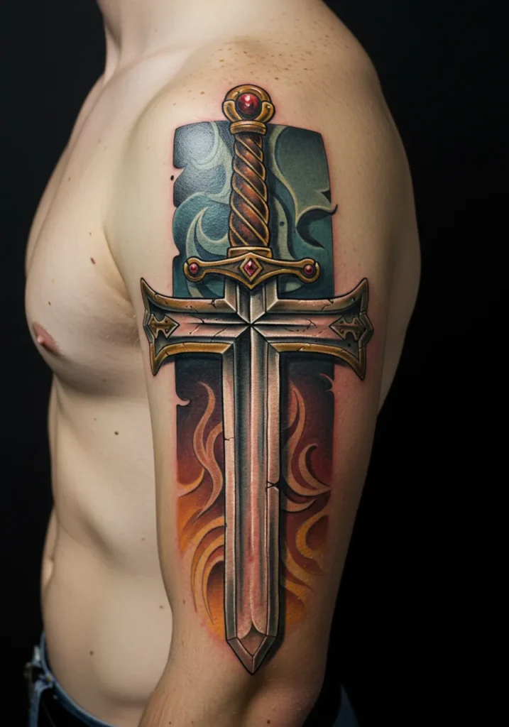 This tattoo takes center stage with a detailed sword designed to double as a cross, stretching boldly along the upper arm. The handle is decorated with gold and ruby-red accents, giving it a regal, almost legendary feel. Behind the blade, swirling smoke in muted greens meets a fiery burst of orange and red flames at the bottom, creating a dramatic and powerful backdrop. The shading and highlights make the sword look metallic and almost battle-worn, adding to its fierce and heroic vibe.