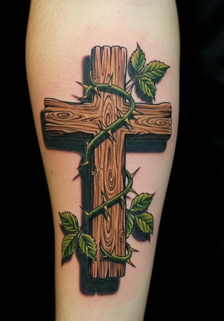This tattoo shows a beautifully detailed wooden cross with deep grain textures that make it look almost real. Twisting around the cross is a green thorny vine, complete with sharp spikes and rich leafy accents. The shading behind the cross gives it a bold pop, while the vines bring it to life with their natural movement and soft green tones. It is placed vertically and sized just right to fit perfectly on the arm or calf, giving it a strong but earthy feel.