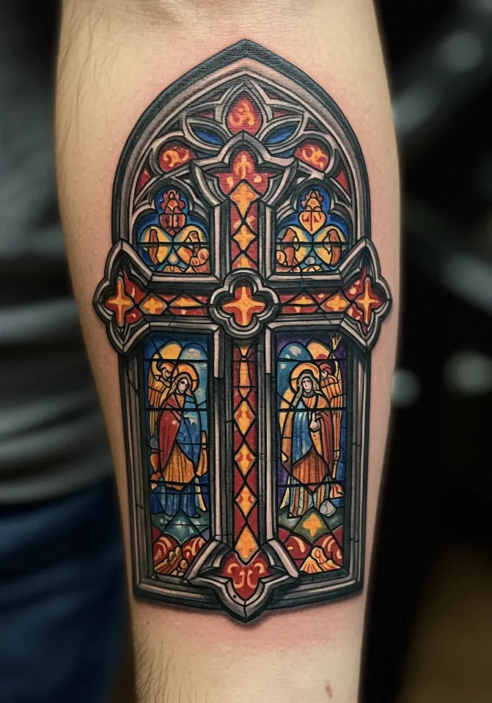 This tattoo looks like a miniature stained glass window brought to life on skin. The design features a bold cross shape filled with colorful glasswork, complete with vivid reds, golds, and blues that shine like little jewels. Inside the panels of the cross are delicate depictions of angels, giving the whole piece a soft and heavenly feel. The intricate black outlines mimic the lead framing of real stained glass, tying everything together in the most stunning way.