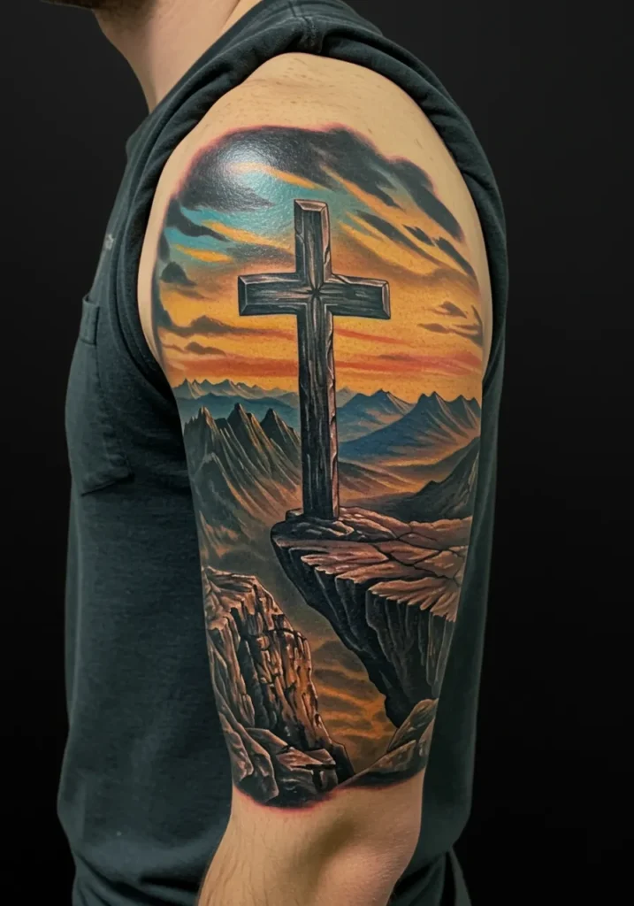 This breathtaking arm tattoo captures a dramatic scene where a rugged wooden cross stands tall on a jagged mountain cliff, set against a glowing sunset sky. The deep oranges, golds, and muted blues of the sky paint a perfect backdrop, making the cross feel even more powerful and enduring. The detailed rocky ledges and rolling mountains stretching into the distance add a real sense of scale and adventure, wrapping around the upper arm beautifully.