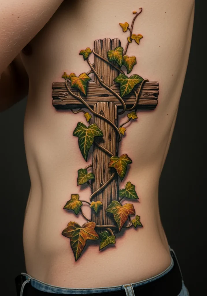 Wooden Cross Tattoo with Ivy Vines on Ribcage