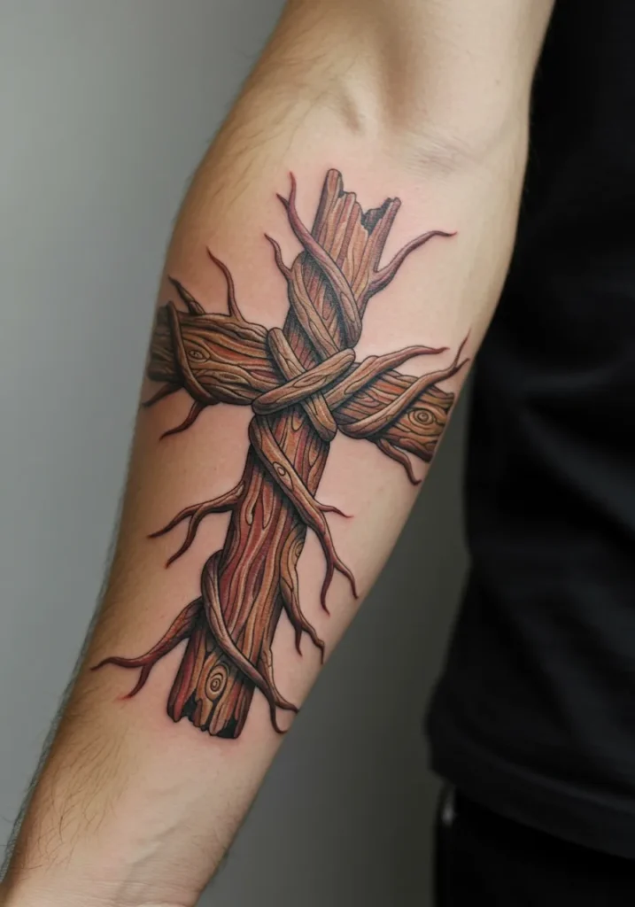 This tattoo brings a rustic and earthy vibe with a cross made entirely out of intertwined tree branches. The wood is beautifully textured with rich shades of brown, and the twisting vines wrap tightly around the cross, making it feel wild and untamed but still full of life. Each branch and root looks organic and raw, almost like they grew naturally into the shape of a cross. The placement along the forearm gives it a strong, natural flow that feels so connected to the body.