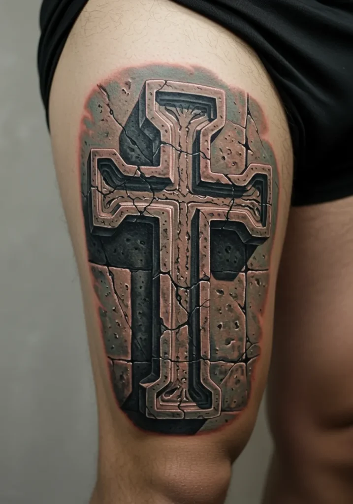 This tattoo looks like it was carved straight into the skin, featuring a powerful stone cross surrounded by cracked and weathered rock. The cross is outlined with deep, chiseled lines that give it an incredible three-dimensional effect, almost like an ancient relic unearthed from a hidden temple. The cracks and rough textures add so much depth and realism, making the whole piece look raw and timeless. The placement on the thigh gives it a big enough canvas to really show off all that gritty, amazing detail.