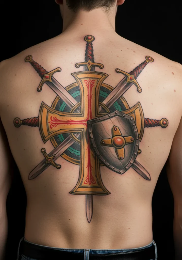 This powerful back tattoo features a bold medieval-style cross at the center, painted in rich gold and deep red tones that practically glow against the skin. Behind the cross, a dramatic circle frames it like a warrior s emblem, while swords crisscross in perfect balance to add a fierce, battle-ready vibe. A steel shield rests on the lower right, detailed with rivets and a golden centerpiece that ties the whole design together. The layout flows naturally across the back, making it feel like armor etched right into the skin.