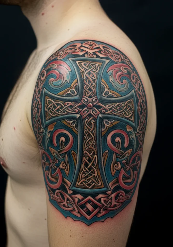 This tattoo wraps the upper arm in an amazing Celtic cross, filled with beautifully detailed knotwork and swirling patterns. Rich shades of teal, gold, and soft reds weave through the design, giving it a sense of depth and movement without overwhelming the eye. Every section of the cross is connected by endless loops and twists, symbolizing eternity and strength. The background flows seamlessly into the cross, making the whole piece feel like a complete work of art that belongs exactly where it is.