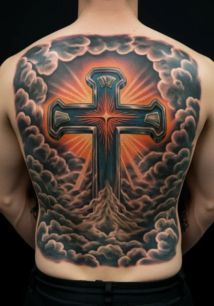 Glowing Cross Tattoo with Clouds and Rays Full Back Piece