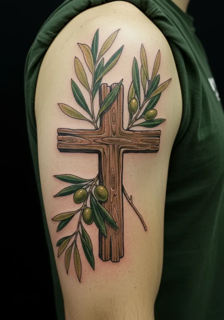 Wooden Cross Tattoo with Olive Branches on Upper Arm