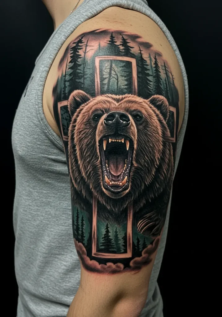 This breathtaking tattoo features a roaring grizzly bear bursting through a bold cross, with a misty pine forest stretching behind it. The shading is rich and powerful, making the bear look almost alive with its sharp teeth, intense eyes, and wild energy. The background of dark trees framed inside the cross brings such a mysterious, rugged feeling, like a deep breath of crisp mountain air after a thunderstorm.