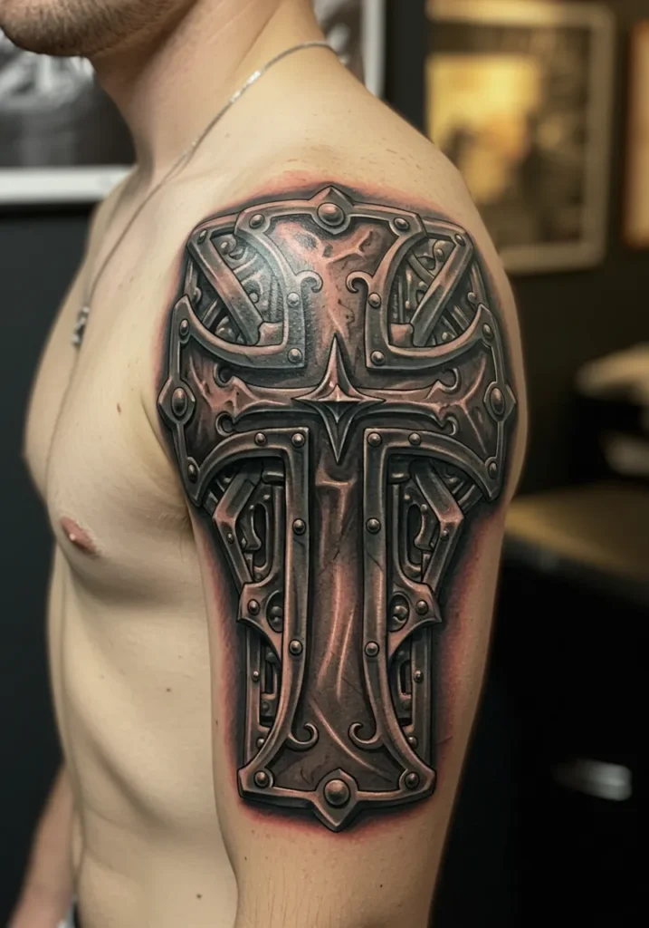 This tattoo shows a bold and powerful cross that looks like it was crafted straight from heavy medieval armor. The cross is full of metallic textures, rivets, and deep shadows that make it feel almost three-dimensional. The shading gives the design a worn, battle-tested look while still making every detail crisp and clean. The way the metal plates curve and bolt together makes it feel like a shield and a symbol of protection all at once, perfectly wrapping the shape of the upper arm.