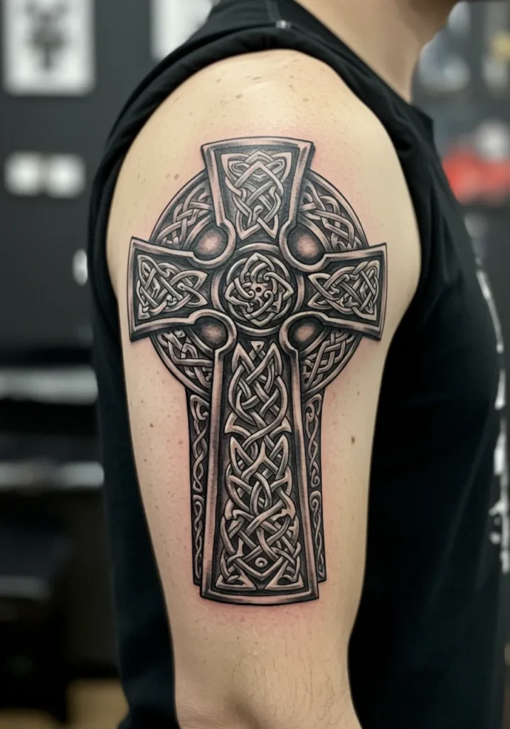 This incredible tattoo brings a Celtic cross to life with the most stunning knotwork pattern you can imagine. Every inch of the design is packed with intricate twists and turns, weaving together to create a powerful symbol of faith, eternity, and strength. The shading is so smooth and detailed that the cross looks almost carved out of ancient stone, giving it a timeless, warrior-like feel that is completely mesmerizing.