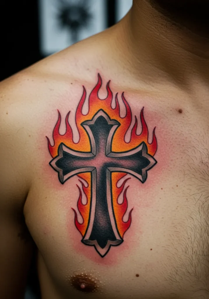 I am absolutely loving how fierce and full of life this tattoo feels. The fire brings so much heat and passion, while the simple cross keeps it grounded and meaningful. It feels like a perfect symbol of inner strength and a little rebellious spirit too. Plus, chest tattoos always feel so powerful and personal, and this one just has that extra spark that makes it unforgettable.