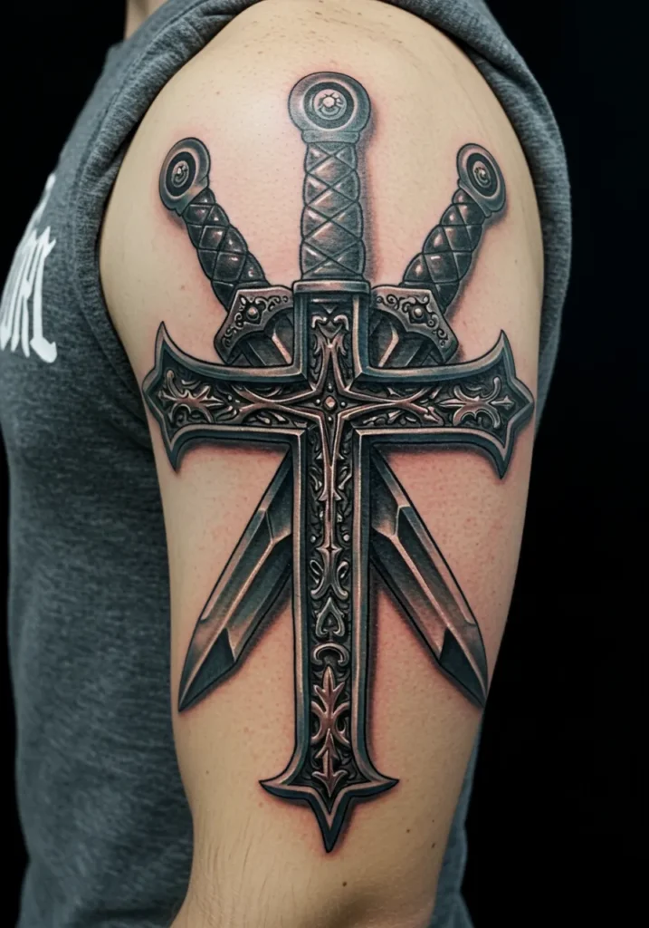 This tattoo is all about strength and honor, featuring a detailed cross set in front of three beautifully crafted swords. The cross is full of elegant carvings that give it an almost royal vibe, while the swords peek out behind it with bold lines and serious edge. The metallic shading makes everything look polished and heavy, like you could almost hear the clash of steel. The placement on the upper arm gives it that classic warrior look that feels strong but also really meaningful.