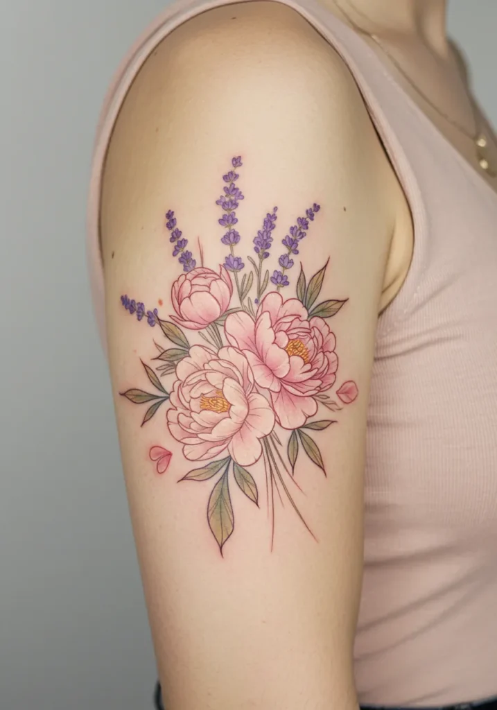 This gorgeous fine line bouquet tattoo features soft pink peonies paired with sprigs of delicate lavender, blooming together in perfect harmony. The peonies are full and lush, with gentle shading that gives them a dreamy, petal-soft texture. The lavender stems rise above with a pop of calming purple, and the muted green leaves tie it all together like a floral symphony. The placement on the upper arm adds a strong, feminine touch without feeling too bold.