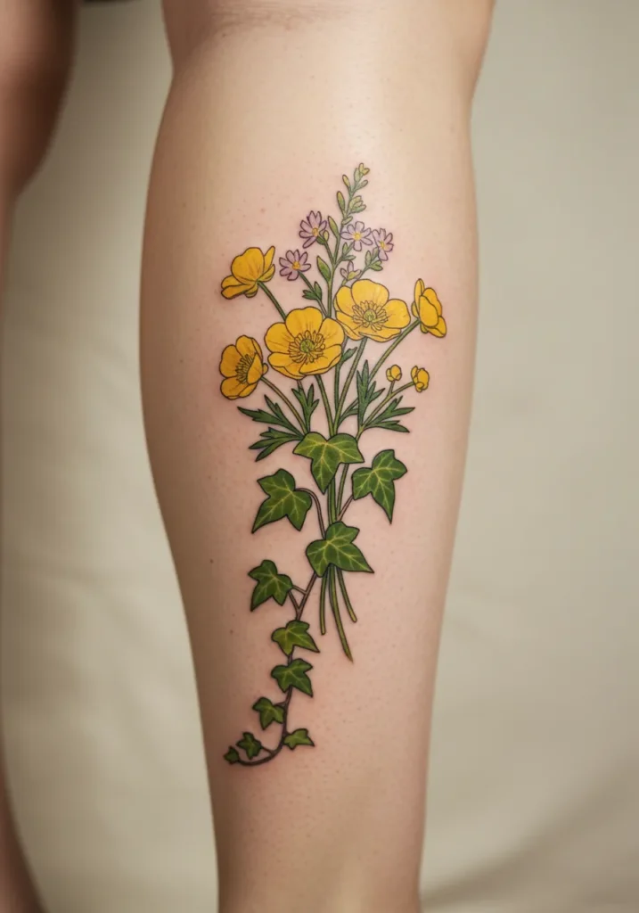 This lovely calf tattoo showcases a whimsical mix of golden buttercups, tiny lavender blossoms, and a bold trail of ivy cascading downward. The fine linework gives the bouquet a clean, polished vibe while still letting the playful nature of the wildflowers shine through. The buttery yellow petals are rich and vibrant, and the deep green ivy brings a gorgeous contrast that balances everything beautifully. The way the ivy curls down the leg gives this piece such an elegant, elongated silhouette.