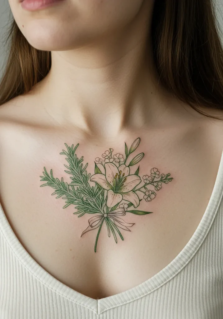 This delicate fine line bouquet tattoo features a soft blush lily surrounded by sprigs of rosemary and tiny baby s breath blossoms, all tied together with a ribbon. The green leaves add a fresh, natural touch, while the light shading on the petals gives the lily just enough color to stand out. The placement just below the collarbone feels intentional and elegant, sitting like a floral brooch at the center of the chest. It s detailed, but still airy and light.