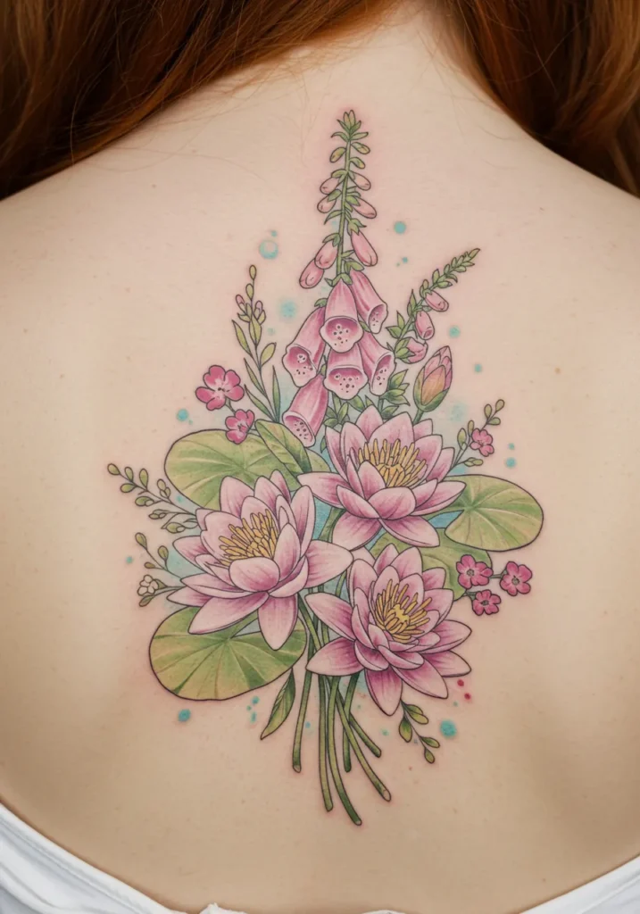 This stunning back tattoo features a lush bouquet of water lilies, delicate foxglove blossoms, and soft pink floral accents, all brought to life with gentle fine lines and dreamy pastel shading. The lotus flowers bloom wide with soft gradients of pink and cream, while the foxglove stems rise above like elegant towers of detail. Light green lily pads balance the base, and the soft turquoise and teal dotting in the background adds a little splash of whimsy.