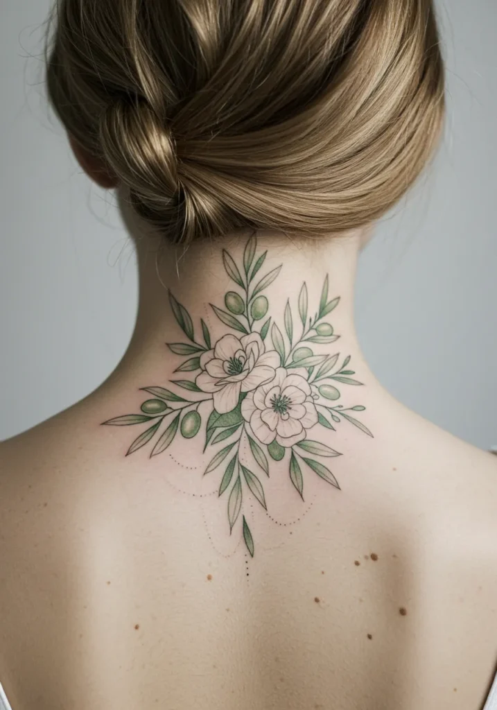 This elegant fine line bouquet tattoo features two soft blush flowers nestled among clusters of olive leaves and buds, gracefully placed at the base of the neck. The petals are shaded with a whisper of color, while the leaves pop in soft greens, giving the entire piece a balanced, serene feel. The layout fans out gently along the neck and upper back, and those dotted accents add just a little extra magic without overwhelming the design.