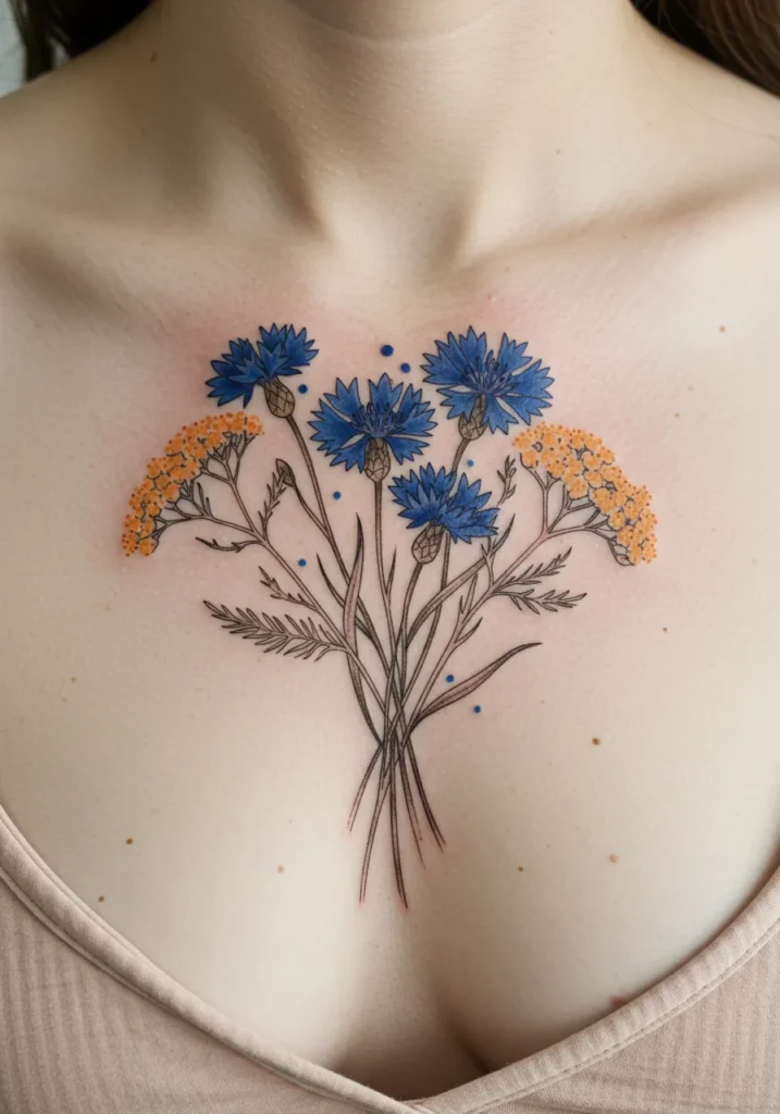 This gorgeous fine line bouquet tattoo features an elegant mix of vibrant blue cornflowers and sunny yellow yarrow blossoms. The stems intertwine naturally, creating a soft upward shape that hugs the upper chest perfectly. Each flower is colored with precision, and the fine black lines give the design a graceful, delicate feel. The small blue dots scattered between the blooms add a dreamy, almost whimsical vibe that ties the whole piece together.