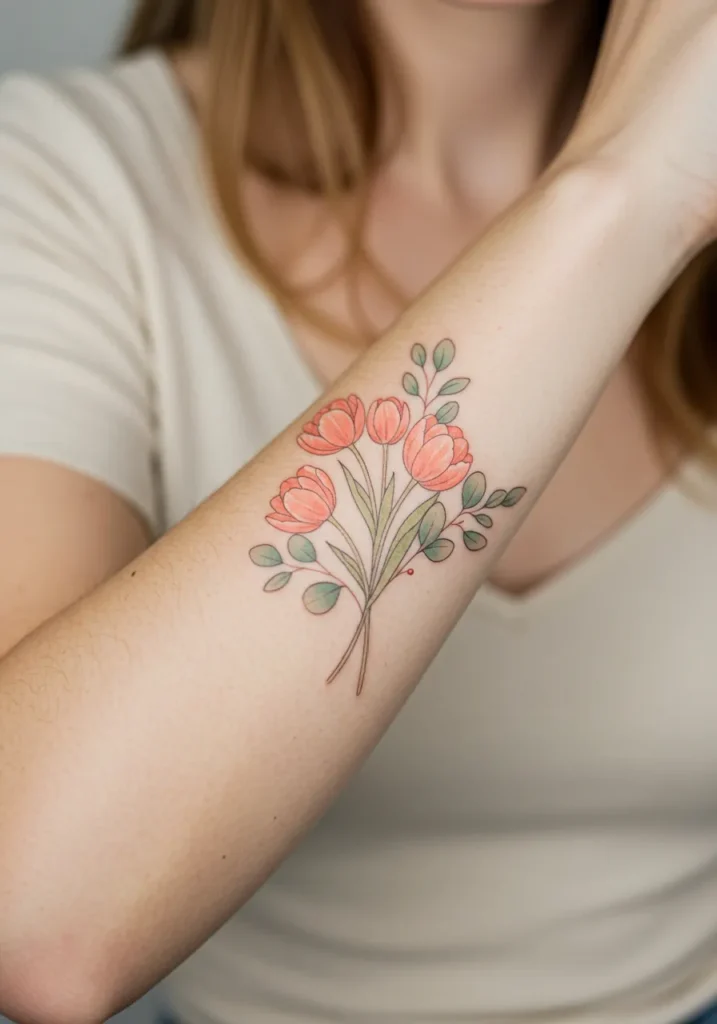 This dainty bouquet tattoo features a handful of soft coral-pink tulips gathered together with muted sage green leaves. The stems are fine and minimal, giving the entire design a delicate and airy feel. It s placed perfectly on the inner forearm, almost like the flowers are resting there naturally. The soft shading and gentle curves make it look light as a breeze, with just enough detail to feel polished but not overworked.