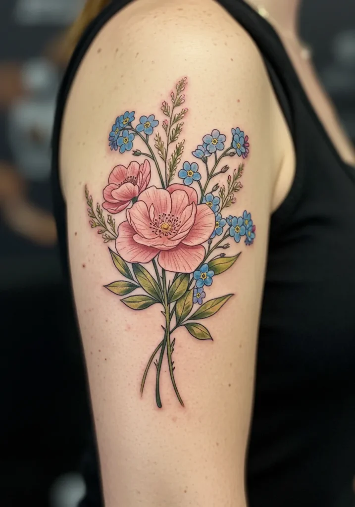 This vibrant fine line bouquet tattoo features soft pink poppies surrounded by clusters of tiny blue forget-me-nots, creating a perfect mix of bold and delicate. The petals are shaded with just enough softness to feel romantic, while the greenery brings balance with clean outlines and natural flow. Placed beautifully on the upper arm, the bouquet stretches upward with a graceful curve, almost like it s blooming right out of the skin.