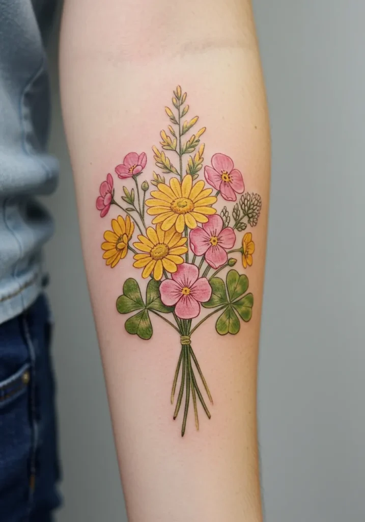 This colorful fine line bouquet tattoo features a cheerful mix of yellow daisies, pink wood sorrel, and lush green clover leaves, all tied together in the cutest little bunch. The flowers are bright and happy without being over-the-top, and each petal and leaf is outlined with soft fine lines that give it a fresh, sketchbook look. The whole design sits neatly on the forearm, standing tall like a little garden growing from your skin.